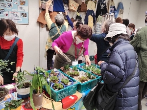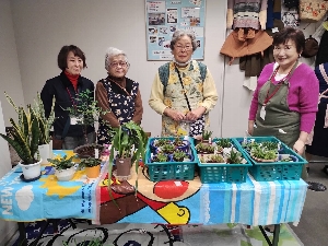 | 今年のバザー担当のさざ波メンバーと植木を出品されたお二人が売り子となり、エプロンをかけて、笑顔でお客様をお迎えしました。 予定の10時前からお客様の列ができ、15分も早い開店となり、このバザーを楽しみにして来てくださる市民の皆様の多さに驚きました。バザー会場は、大盛況。「いらっしゃいませ~」「ありがとうございました~」の元気な声が会場のあちこちから聞こえてきます。売り子さんたちも、生き生きと楽しそうに接客していました。 |